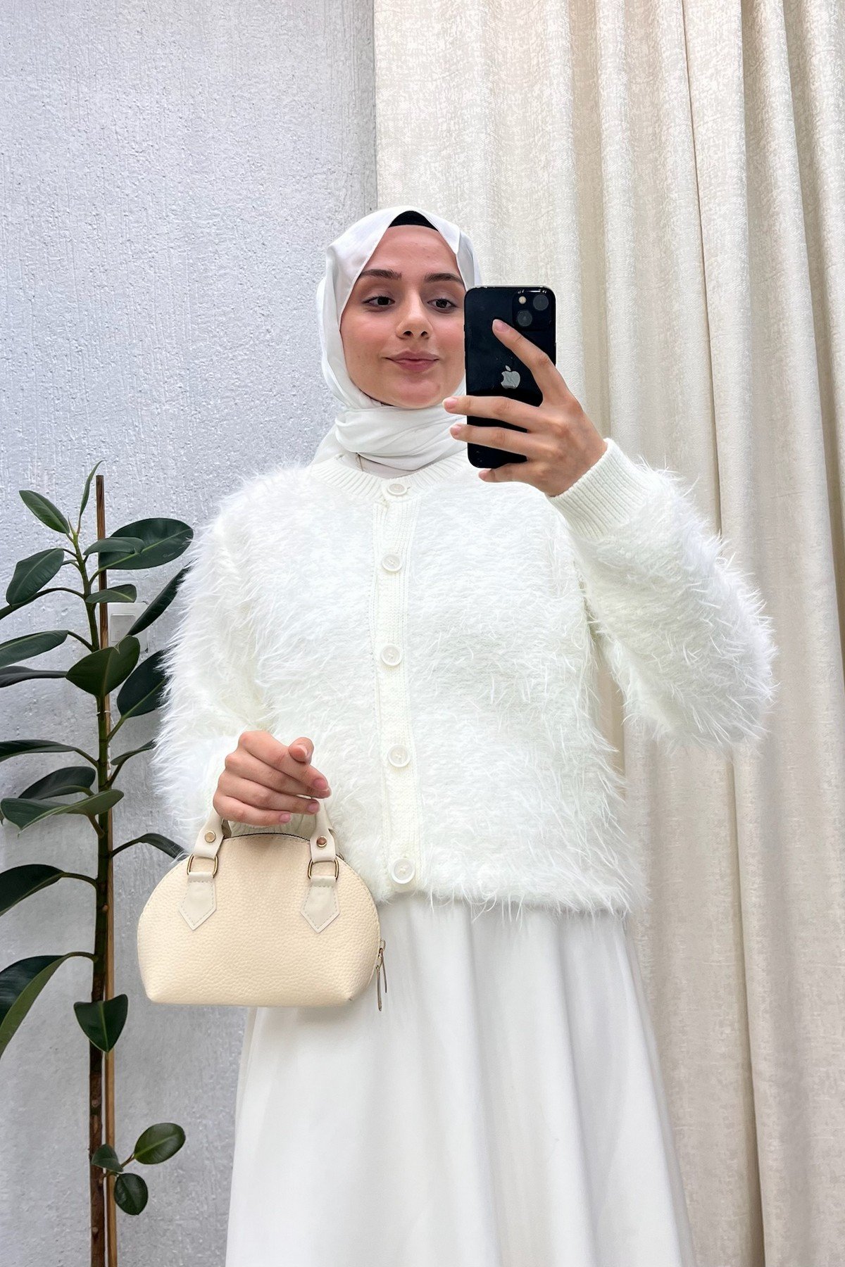 Düğmeli Sakallı Yumoş Hırka Beyaz