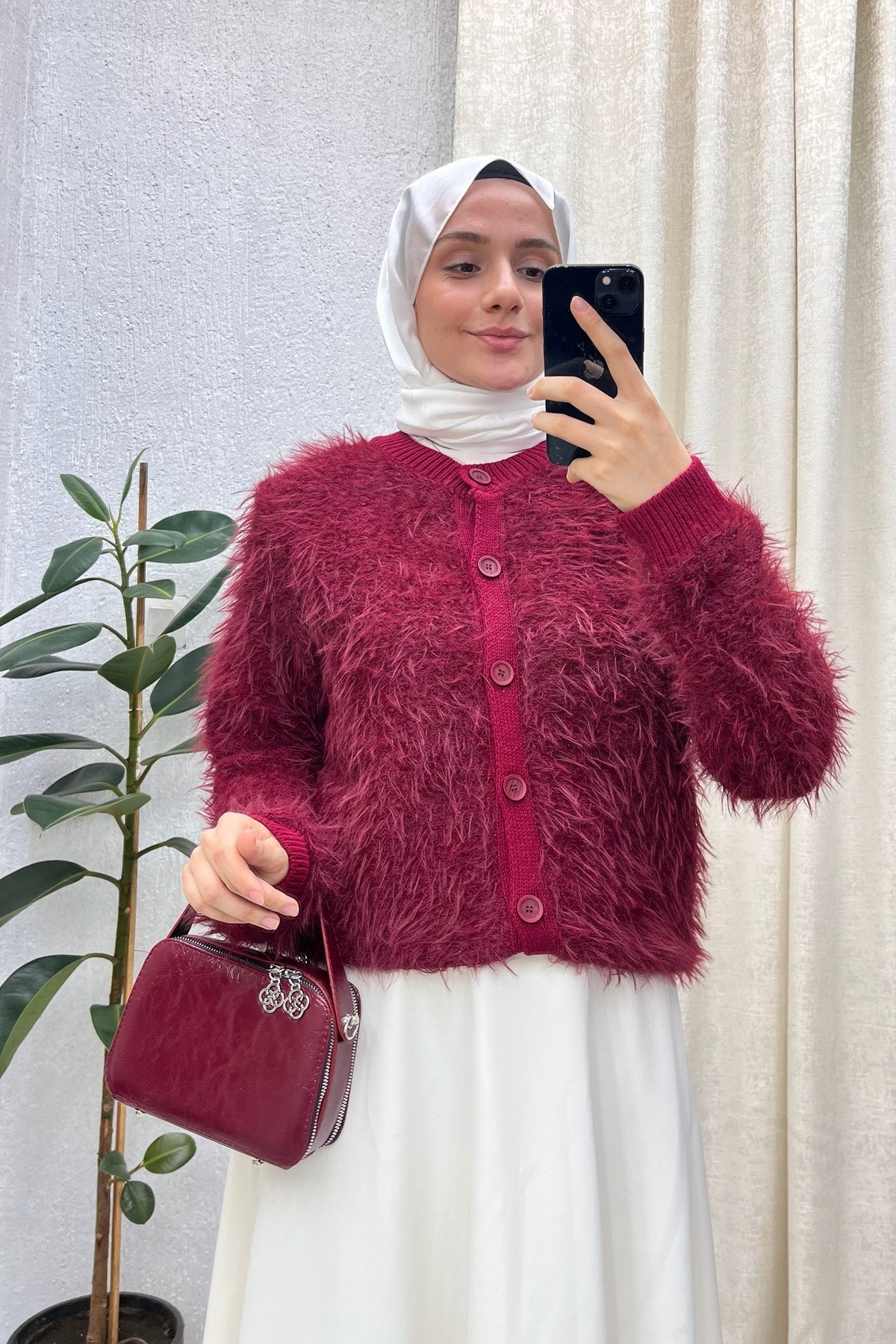 Düğmeli Sakallı Yumoş Hırka Bordo
