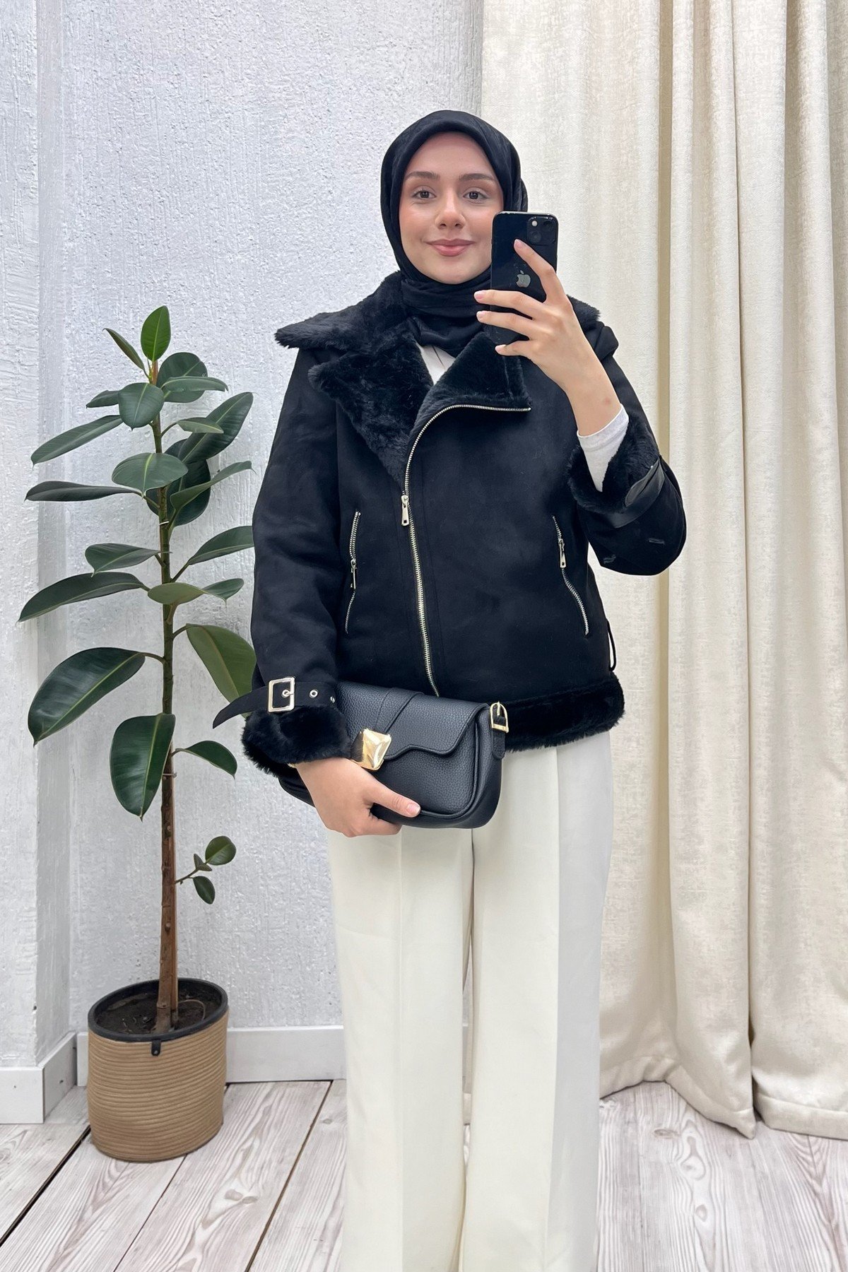 Kürk Yaka Kemerli Süet Biker Ceket Siyah