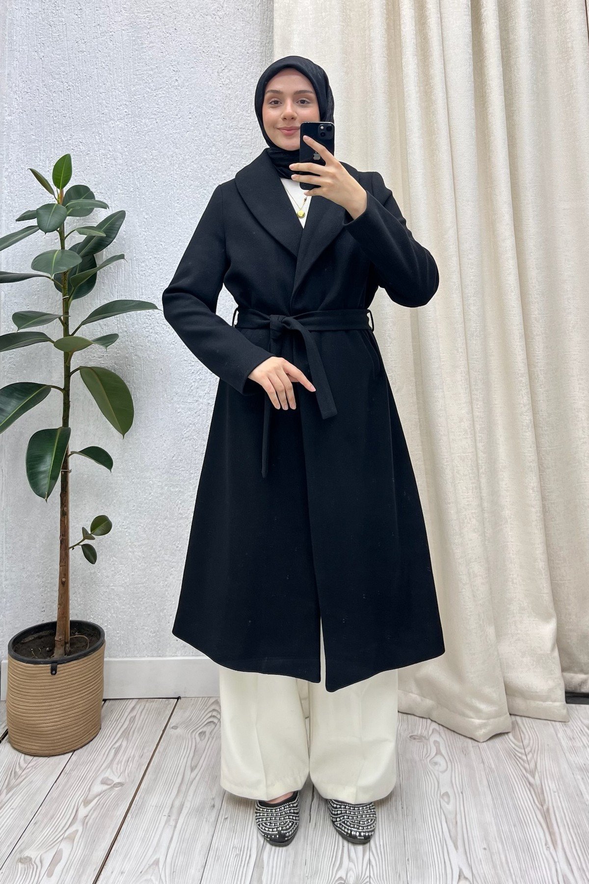 Kuşaklı Uzun Kaşe Kaban Siyah