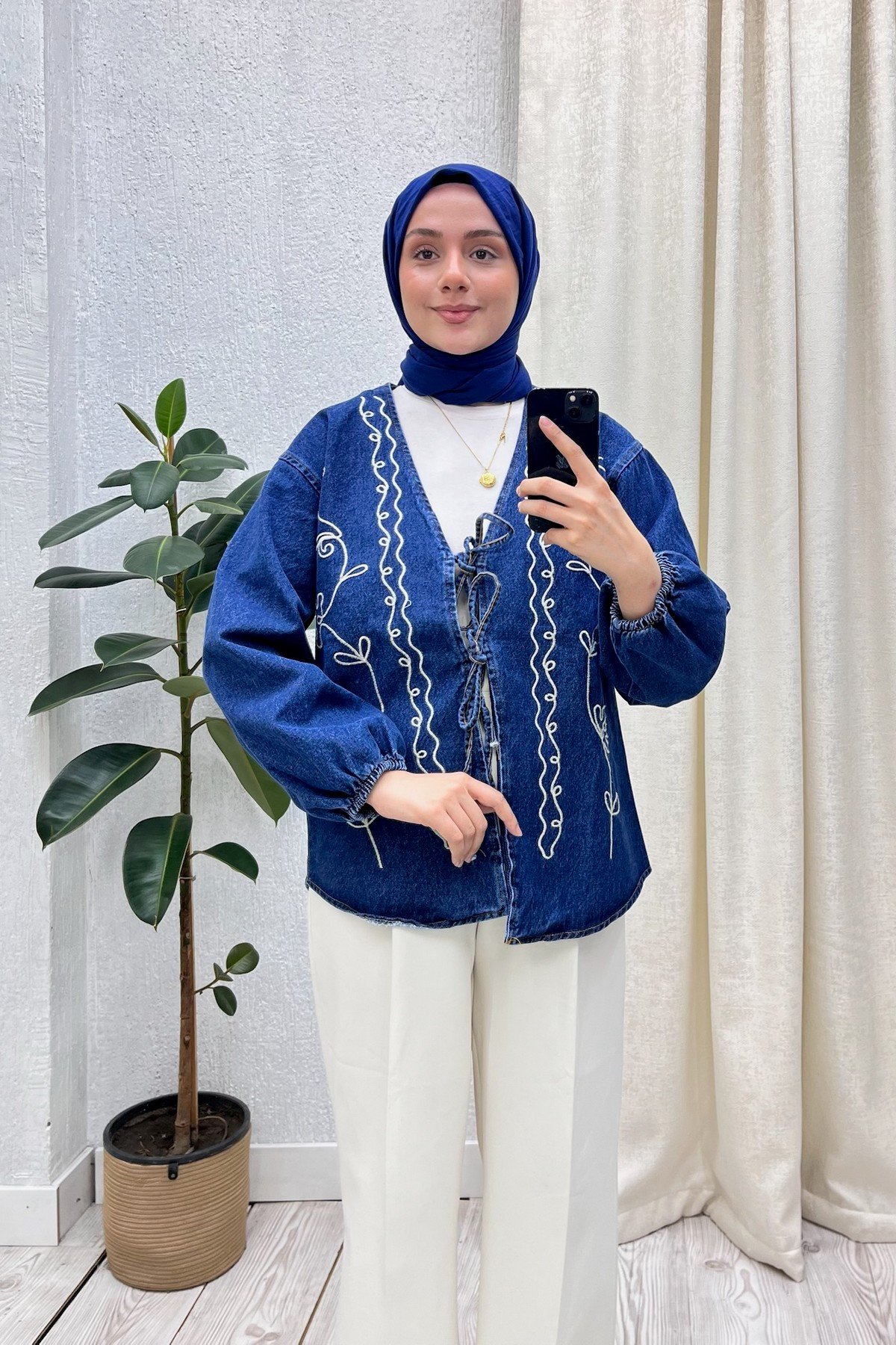 Nakışlı Önü Bağlamalı Kot Ceket Mavi