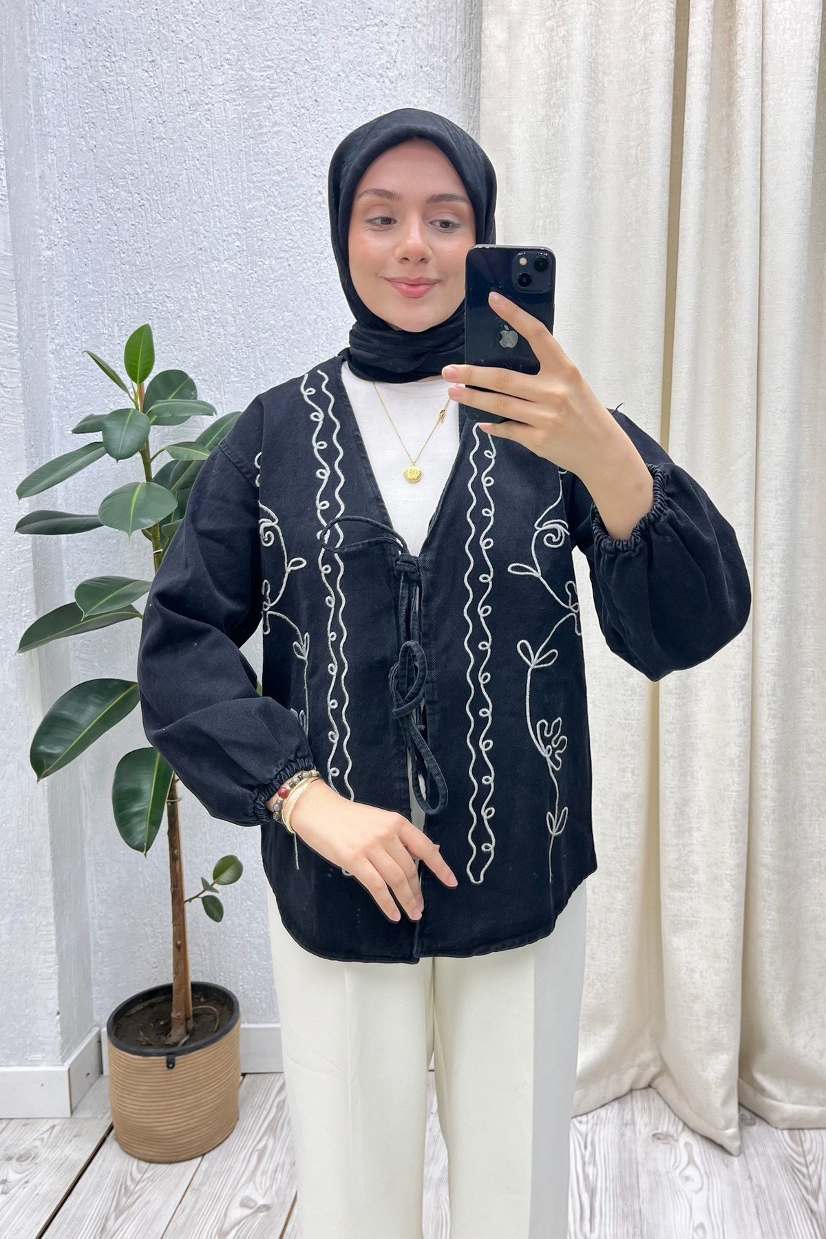 Nakışlı Önü Bağlamalı Kot Ceket Siyah