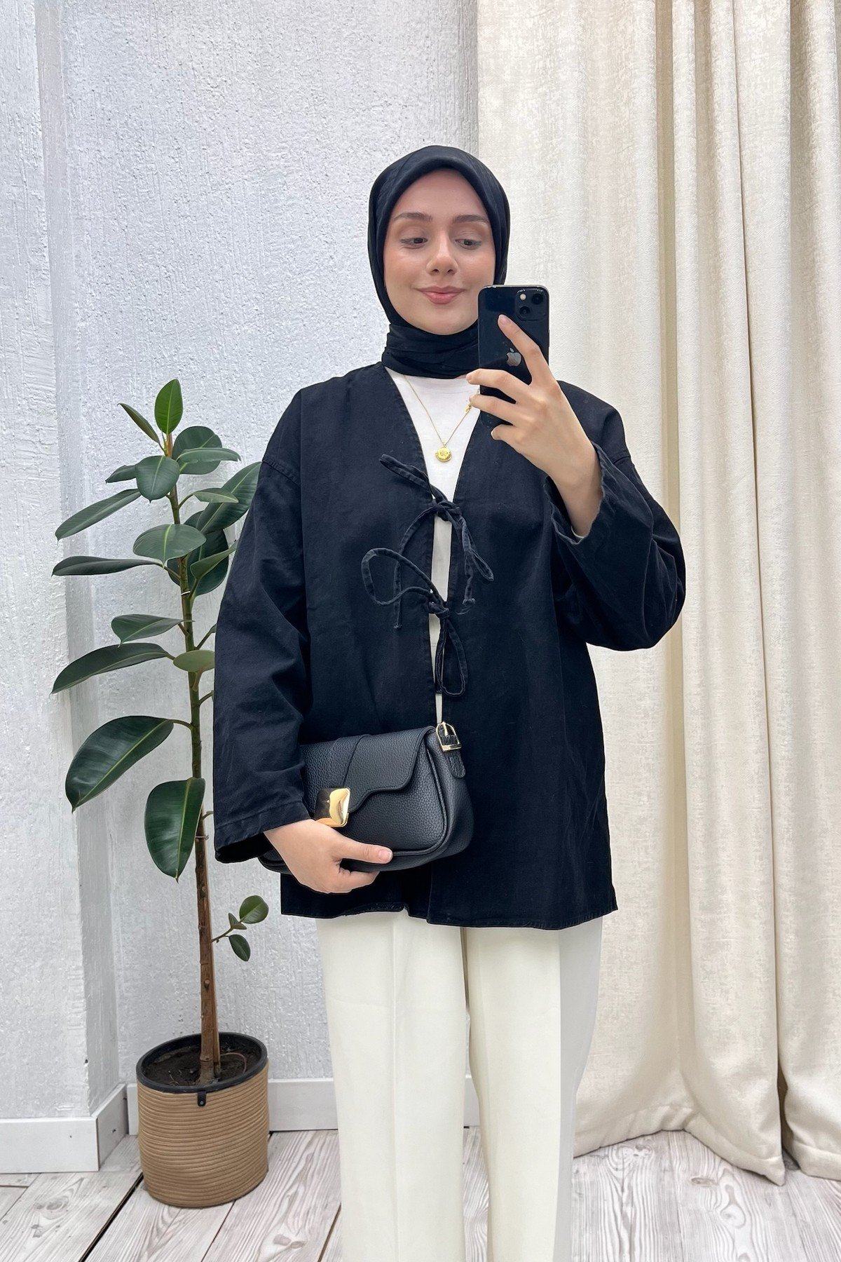 Önü Bağlama Detaylı Kot Ceket Siyah