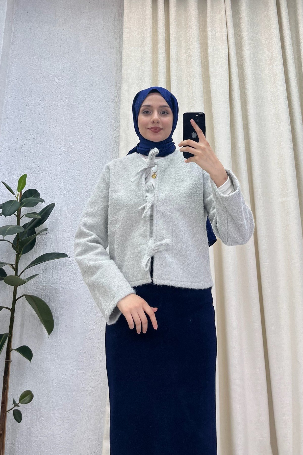 Önü Bağlamalı Kısa Kaşe Ceket Gri