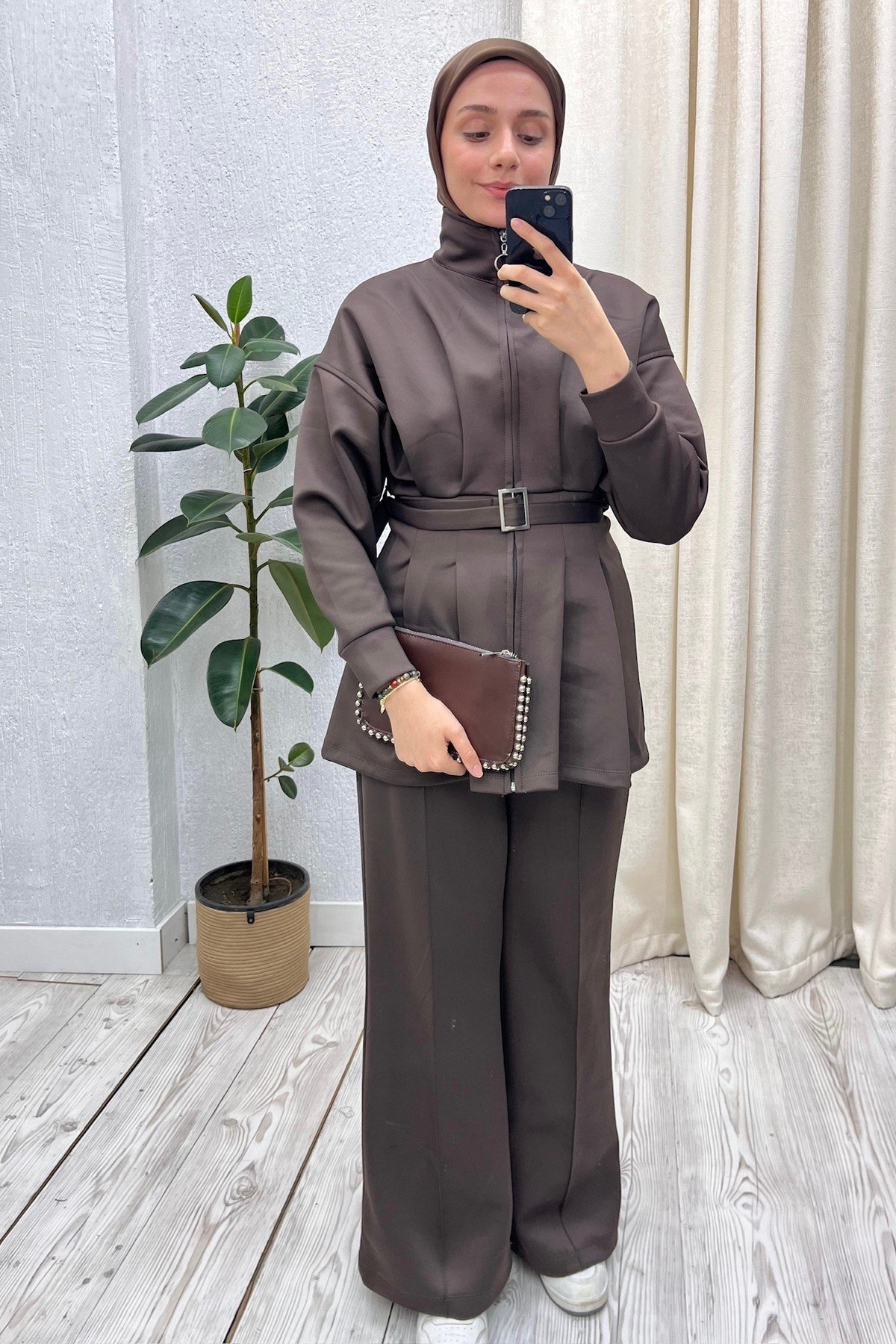 Pensli Kemerli Scuba Pantolon Takım Kahverengi