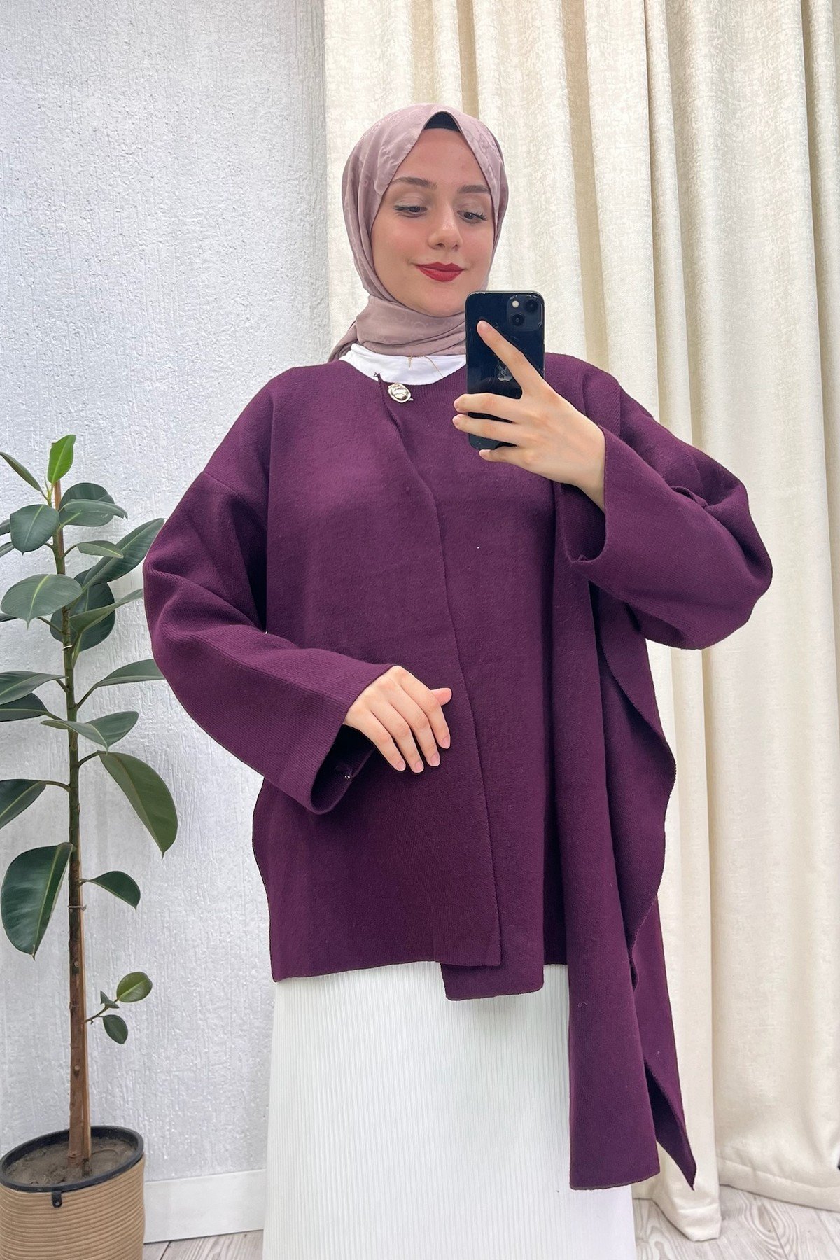 Şal Detaylı Yanları Yırtmaçlı Triko Hırka Mürdüm
