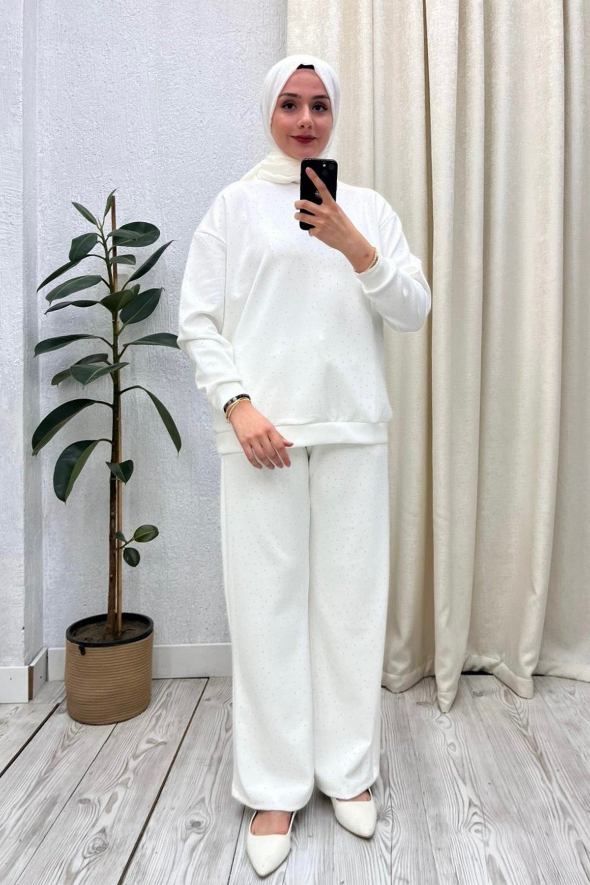 Taşlı Pantolon Takım Beyaz
