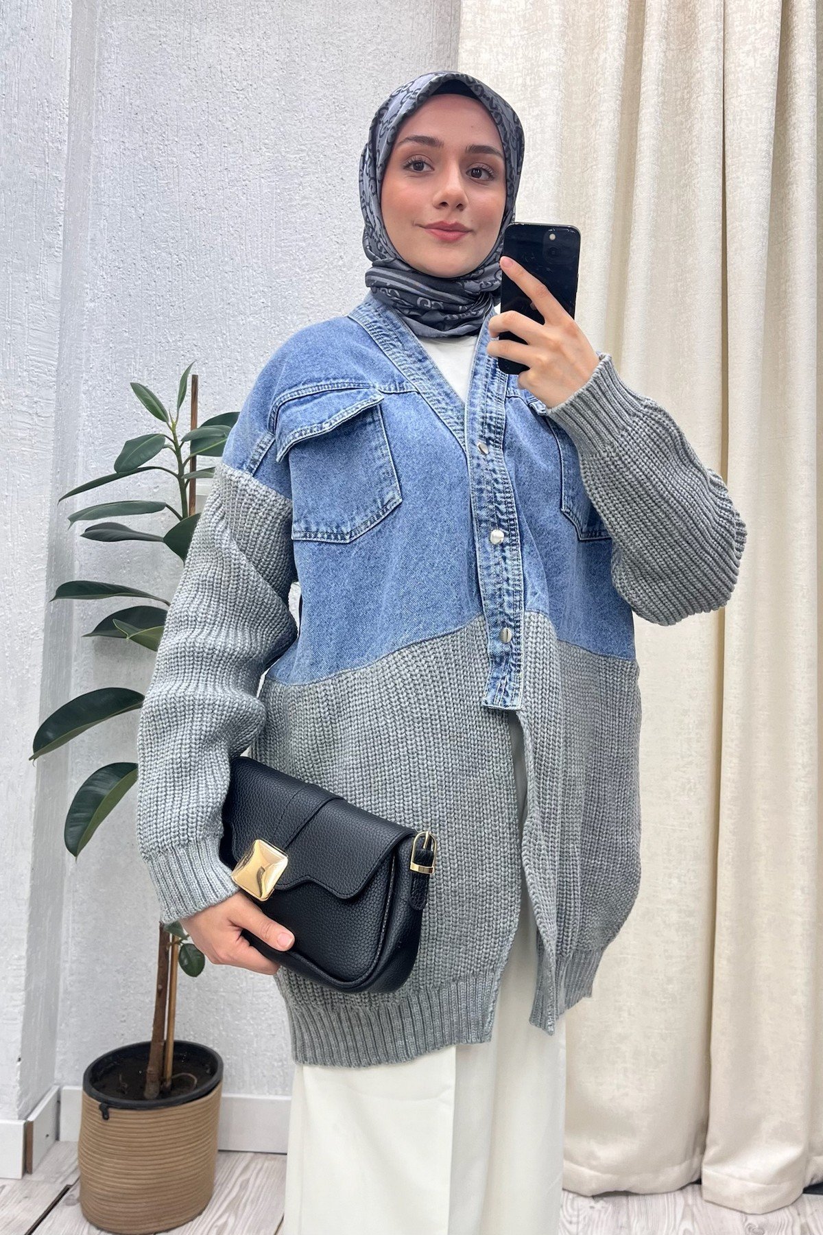 Triko Detaylı Önü Yırtmaçlı Kot Ceket Gri