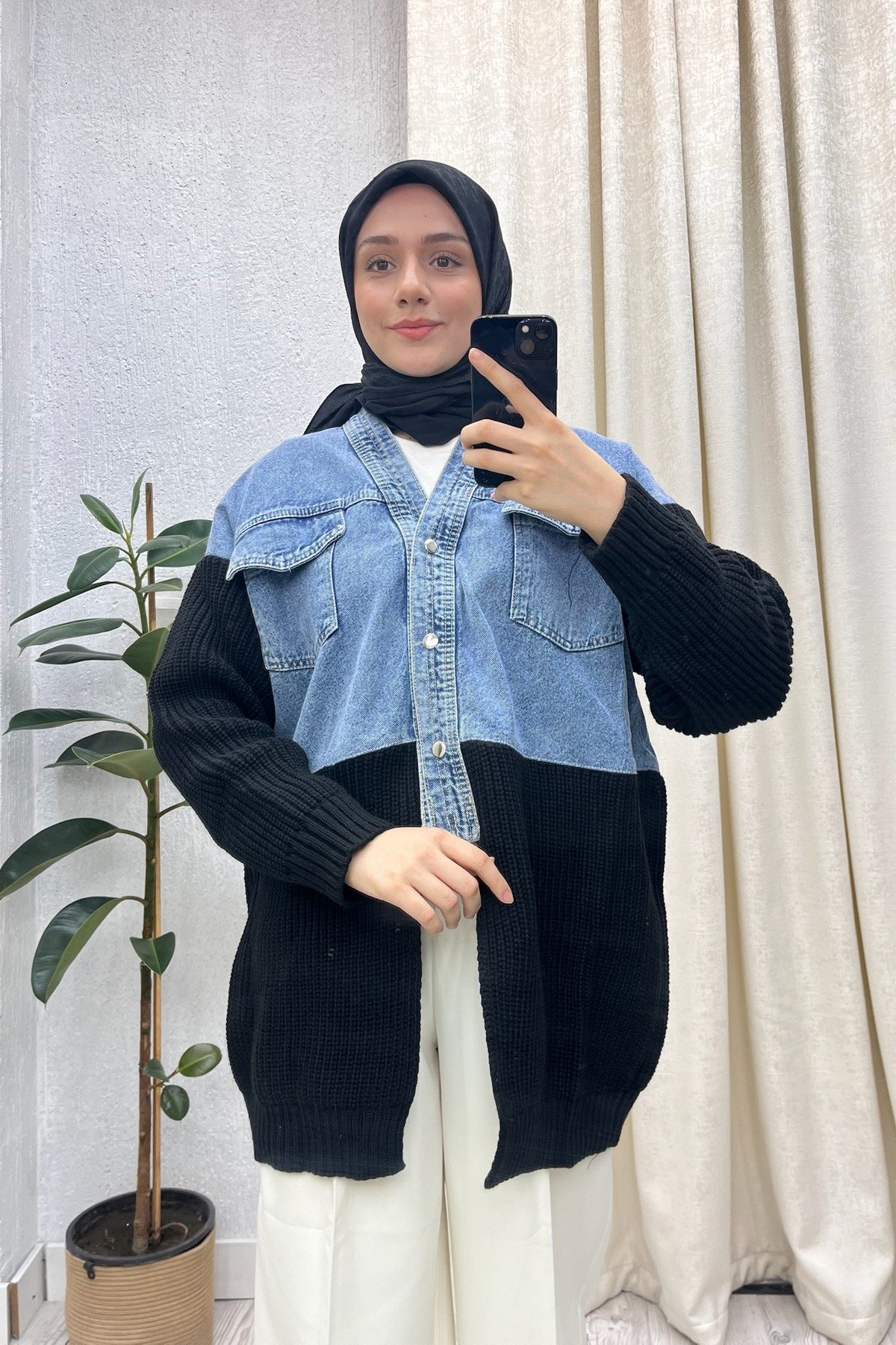 Triko Detaylı Önü Yırtmaçlı Kot Ceket Siyah