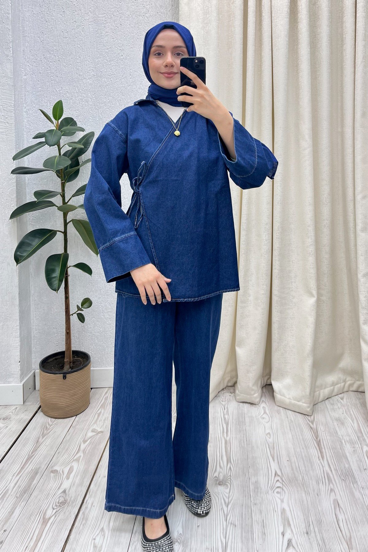 Yandan Bağlamalı Geniş Kol Kot Pantolon Takım Lacivert