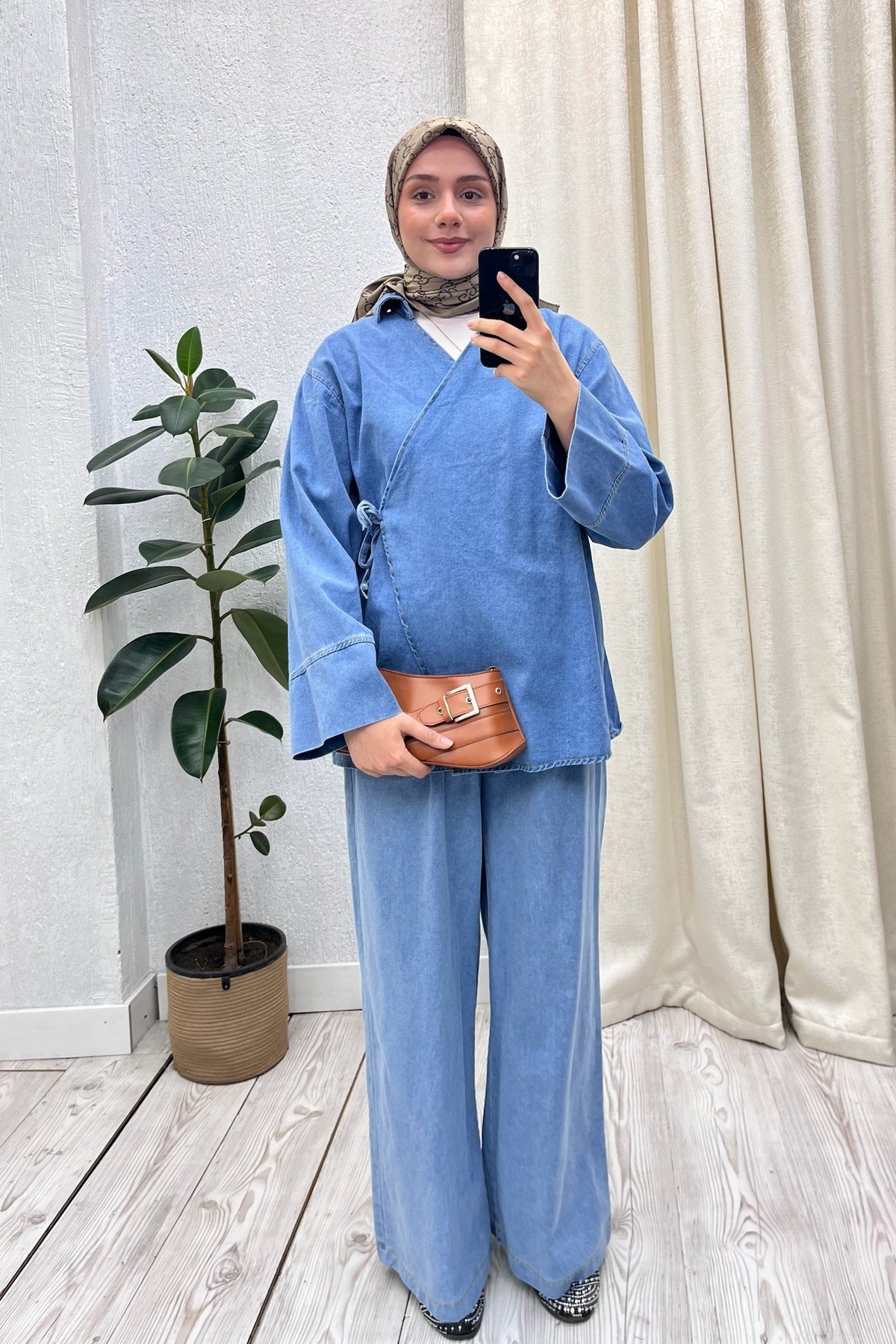 Yandan Bağlamalı Geniş Kol Kot Pantolon Takım Mavi