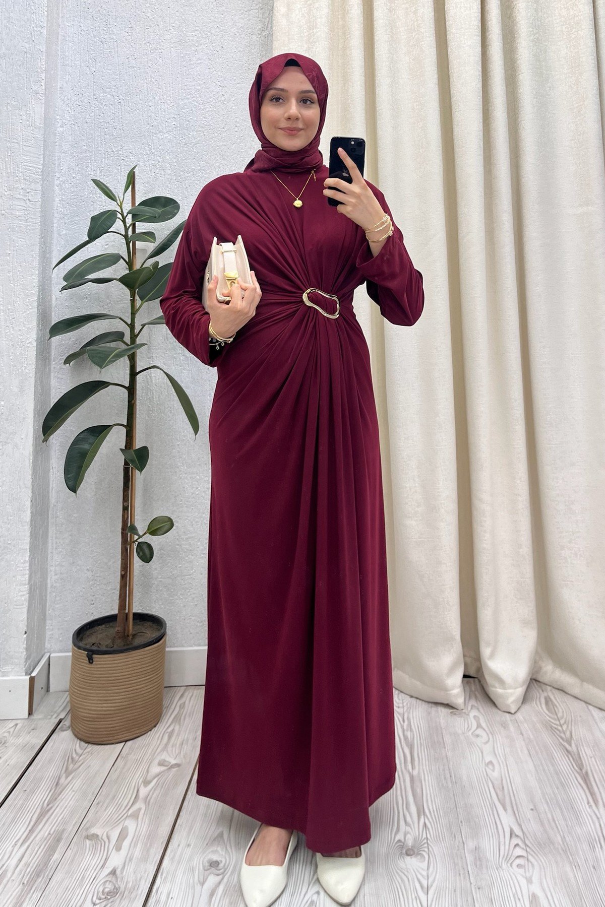 Yandan Bronş Detaylı Drapeli Elbise Bordo