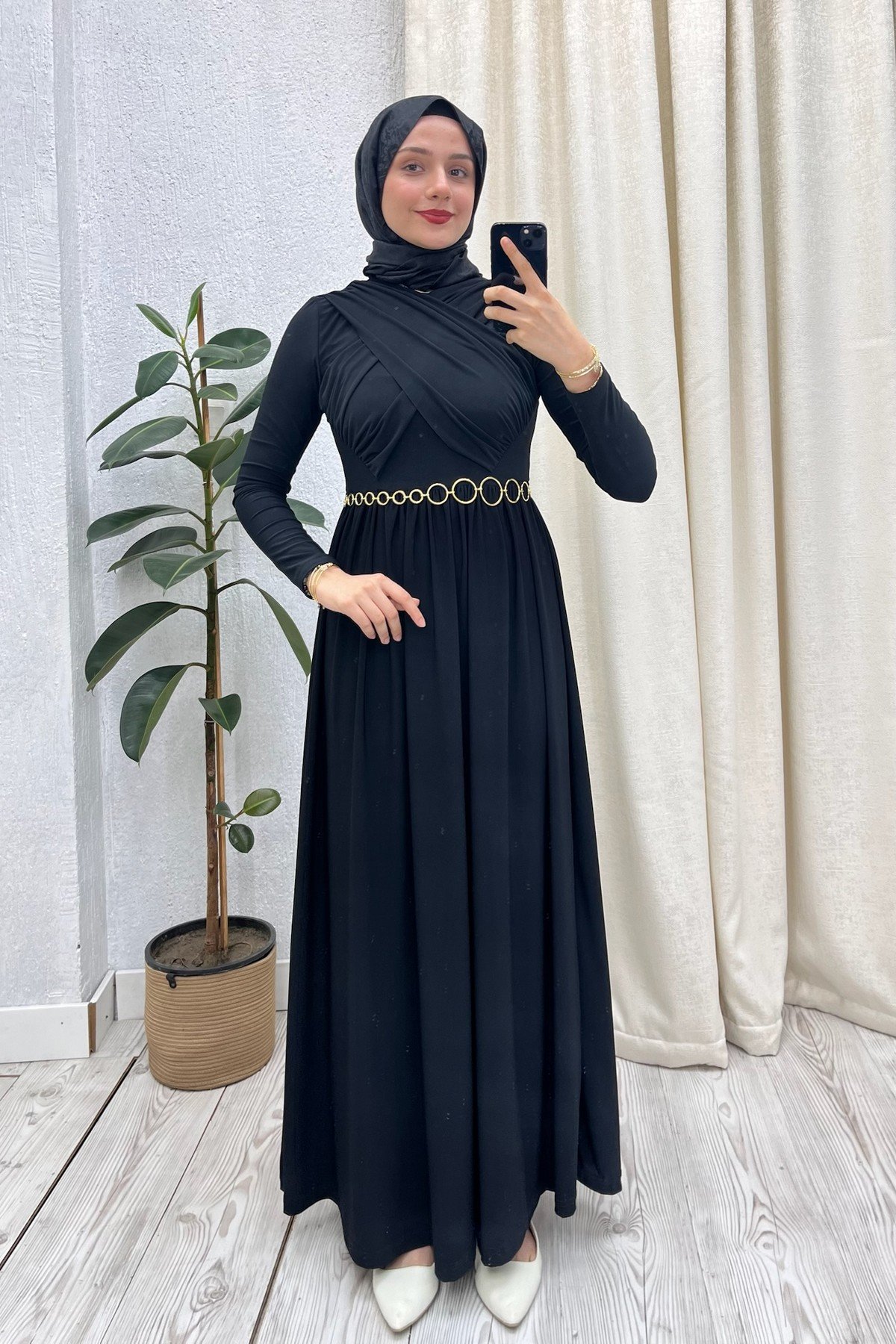 Zincir Kemerli Drapeli Elbise Siyah
